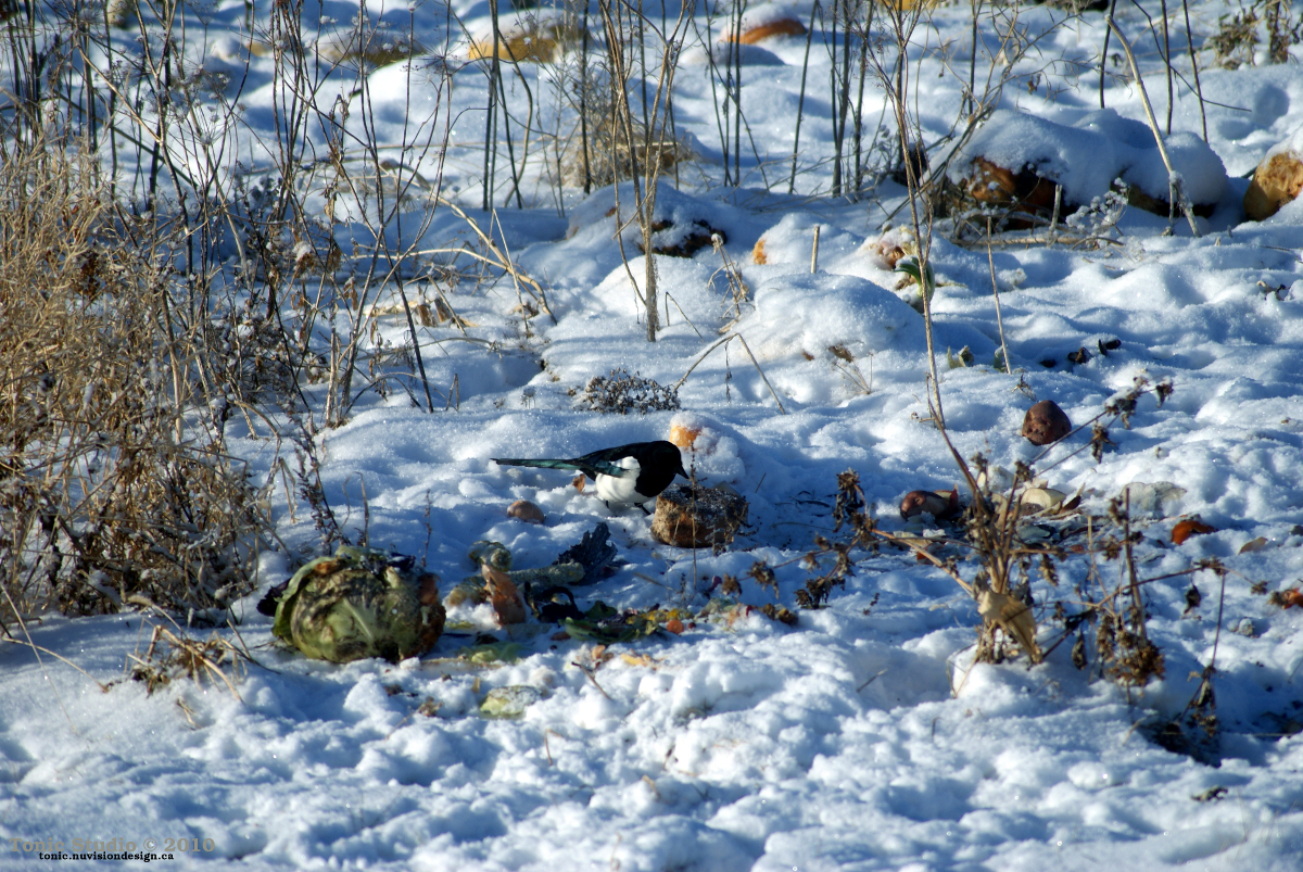 A magpie sneaking a quick bite at a few seeds before the cats spot it.